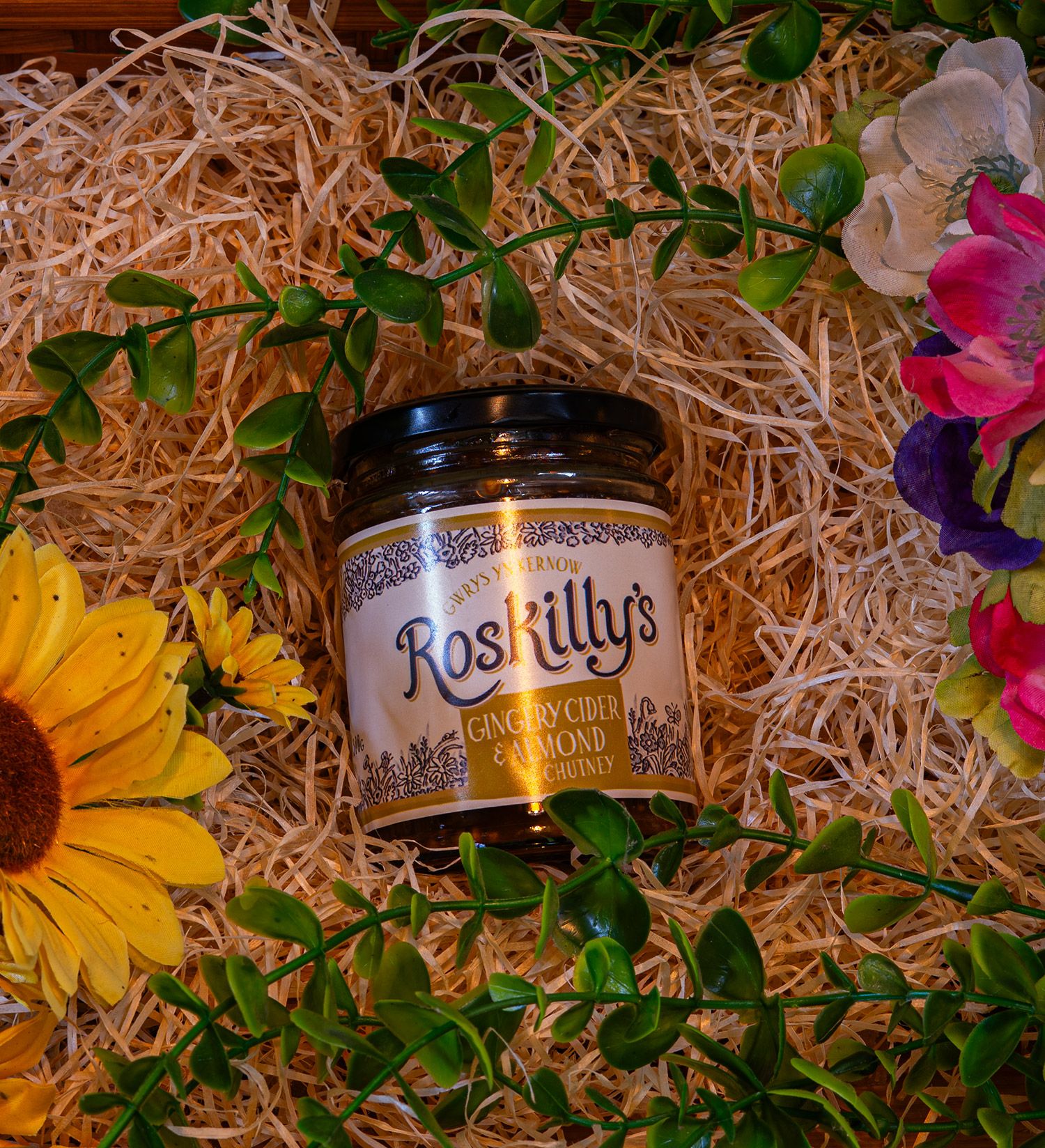 Apples, Light Brown Sugar, Cider Vinegar, Raisins, Ginger 6.5%, ALMONDS (NUTS) 4%, Cornish Cider 2% (SULPHITES), MUSTARD Seeds, Black Treacle, Garlic, Salt, Coriander, Cinnamon, Chilli.